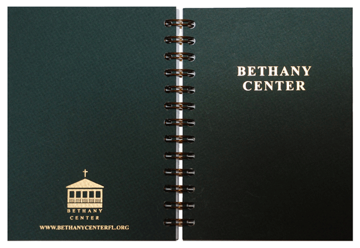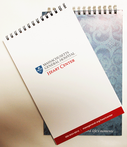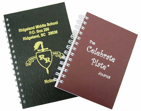 Features:- 50 Gray Ruled or Blank Sheets of Bright White #16 Bond Paper. 15 Point Semi Gloss Covers. Printed 4 Colors on Front Cover. 40 Point Chipboard Backing. Silver, White, Gold or Black Wire-O Binding. Optional 40 Point Kraft/Natural 100% Recycled Board Cover with a 1 color screen imprint.