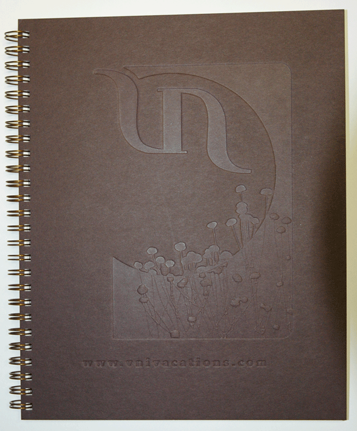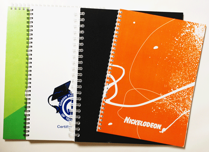 Features:- 0 Ruled or Blank Sheets of Bright White #20 Bond Paper. 15 Point Semi Gloss Covers. Printed 4 Colors on Front Cover. 40 Point Chipboard Backing. Silver, White, Gold or Black Wire-O Binding. Optional 40 Point Kraft/Natural 100% Recycled Board Cover with a 1 color screen imprint.